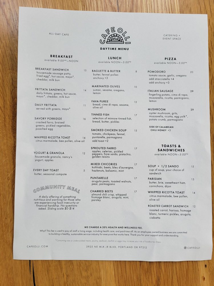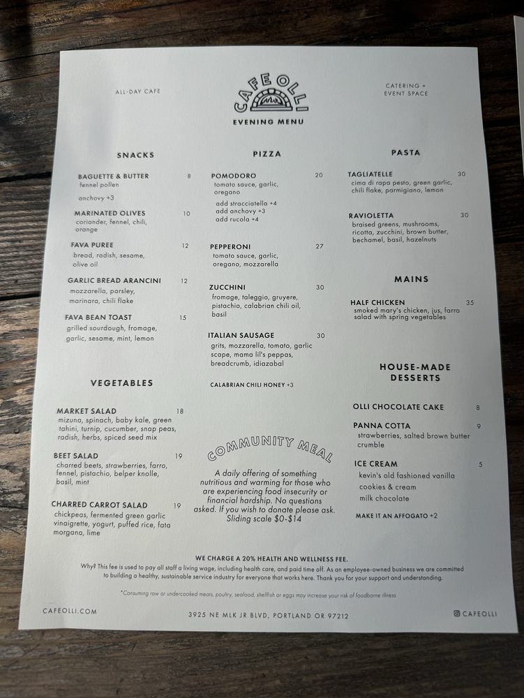 Introducing the menu at Cafe Olli, a quaint venue located in Portland, Oregon, known for its exceptional food and cozy atmosphere. Offering a unique selection of dishes like the zucchini and pistachio pizza, Italian sausage pizza, and ravioletta, this spot is a must-visit for those seeking culinary delight. The food here is described as phenomenal by patrons, with fresh and delicious ingredients used to create memorable flavors. The cocktails are also highly praised, adding to the overall dining experience. Customers recommend trying the chickpea and snap pea salads, along with the unique polenta-topped pizzas. With a focus on quality over quantity, Cafe Olli delivers dishes that are sure to impress. Whether you're looking for a casual brunch or a special birthday dinner, this place promises to leave a lasting impression. Treat yourself to a dining experience at Cafe Olli and indulge in their delectable offerings.